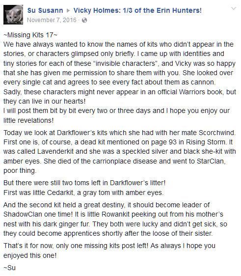 - Первоначально Лавандочка принадлежал(-а) проекту "Missing Kits". Лавандочка была крапчатой серебристо-чёрной кошкой с янтарными глазами. Она умерла от болезни с Гнили в «Бушующей стихии»[9]. Кудряшка и Цепкохвост приходились ей единоутробными сестрой и братом[10].