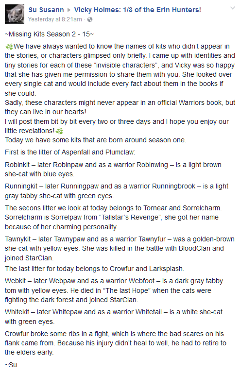 - По проекту Missing Kits Осинник и Черносливка ― пара, а их котята ― Малиновка (Robinwing) и Быстринка[6]. Осинник умер и попал в Звёздное племя[7].