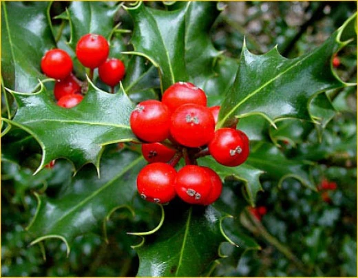 | Остролист (падуб) | Раскидистый куст с блестящими колючими листьями. Красные ягоды, растущие на таких кустах, ядовиты. | |